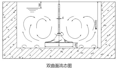 G/Q/FSJ型系列曲面攪拌機曲面葉輪體上表面為雙曲線母線繞葉輪體軸線旋轉形成的雙曲面結構,其特有的葉輪結構設計,較大限度地將流體特性與機械運動相結合。雙曲線的方程為xy=b曲線沿y軸旋轉而構成的曲面體;為了迎合水體流動,設計從葉輪的中心進水,這一方面減少了進水紊流,另一方面保證了液體對葉輪表面的壓力均勻,從而保證整機在運動狀態下的平衡。在漸開雙弧面上均布有八條導流葉片,借助液體自重壓力作補充進水獲得的勢能與葉輪旋轉時產生的離心力形成動能,液體在重力加速度的作用下經雙曲面結構過渡沿葉輪圓周方向作切線運動,在池壁的反射作用下,形成自上而下地循環水流,故可獲得在軸向(y)和徑向(x)方向的交叉水流(如雙曲面流態圖)。