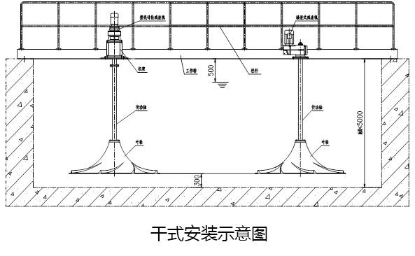 干式安裝的攪拌機先將減速機機架固定在工作橋上,然后只需依次安裝傳動軸,葉輪部件,并固定好電纜,見干式安裝示意圖。