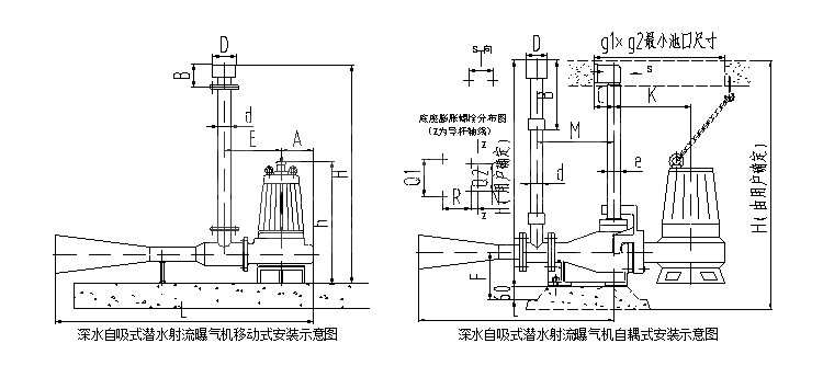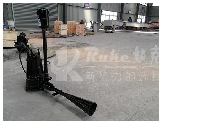 該曝氣機由潛水電泵與噴射泵組成,從而使水體攪動與充氧同時進行,既可獲得較高的氧氣吸收率,又具有葉輪無堵塞優點。