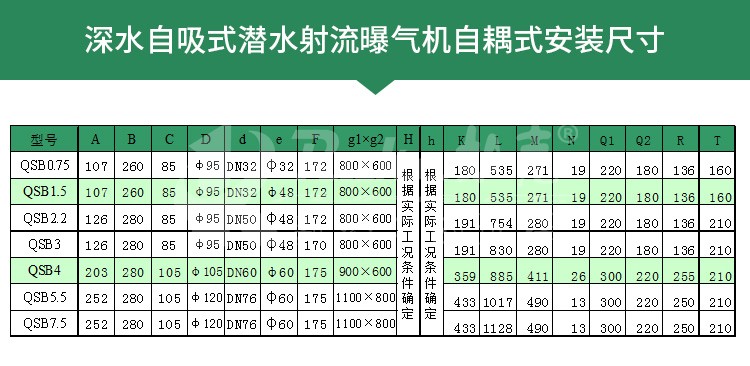 QSB型深水自吸式潛水射流曝氣機可在下列條下下正常連續運行: