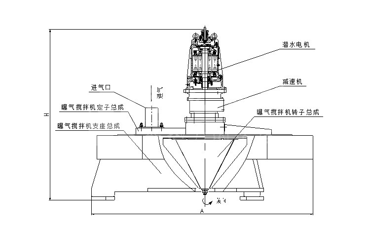 SBJ 產品由潛水電機、減速裝置、葉輪、混合室、底座、輸氣管、起吊鏈組成。如圖