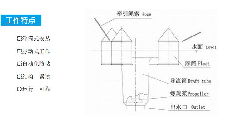 該機主要由浮筒、導流筒、潛水電機和螺旋槳等部件組成,導流筒借助浮筒的浮力呈豎直方向懸浮在水面下,吸口朝上,貼近水面,出水口向下。當電機驅動葉輪高速旋轉時,導流筒吸口上方附近的浮泥連同水被吸入導流筒,在葉輪的作用下經破碎后從導流筒出口泵出,被送入水下。由于浮泥中的空穴被水填充后,其比重大于污水的比重,泵入水下后將不 再上浮。