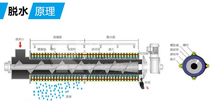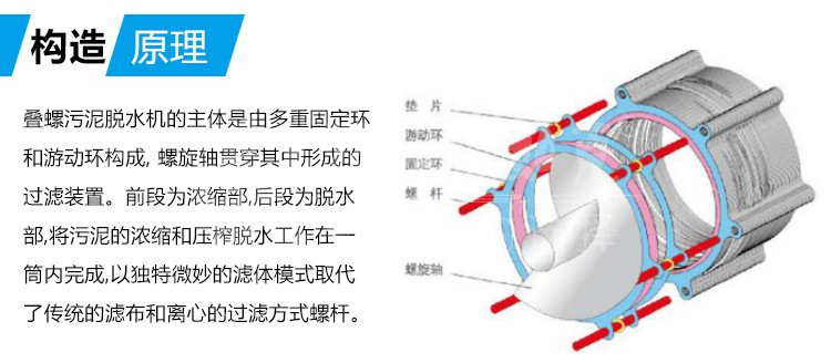 疊螺污泥脫水機是運用了螺杄擠壓原理,通過螺杄直徑和螺距變化產生的強大擠壓力,以及游動環和固定環之間的微小縫隙,實現對污泥進行擠壓脫水的一種新型固液分離設備。