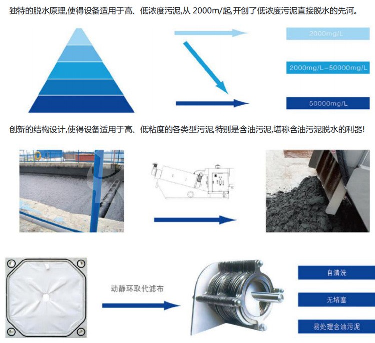 泛使用于市政污水、食品、飲料、屠宰養殖、印染、石油化工、造紙、皮革、制藥等各行業的污泥脫水。